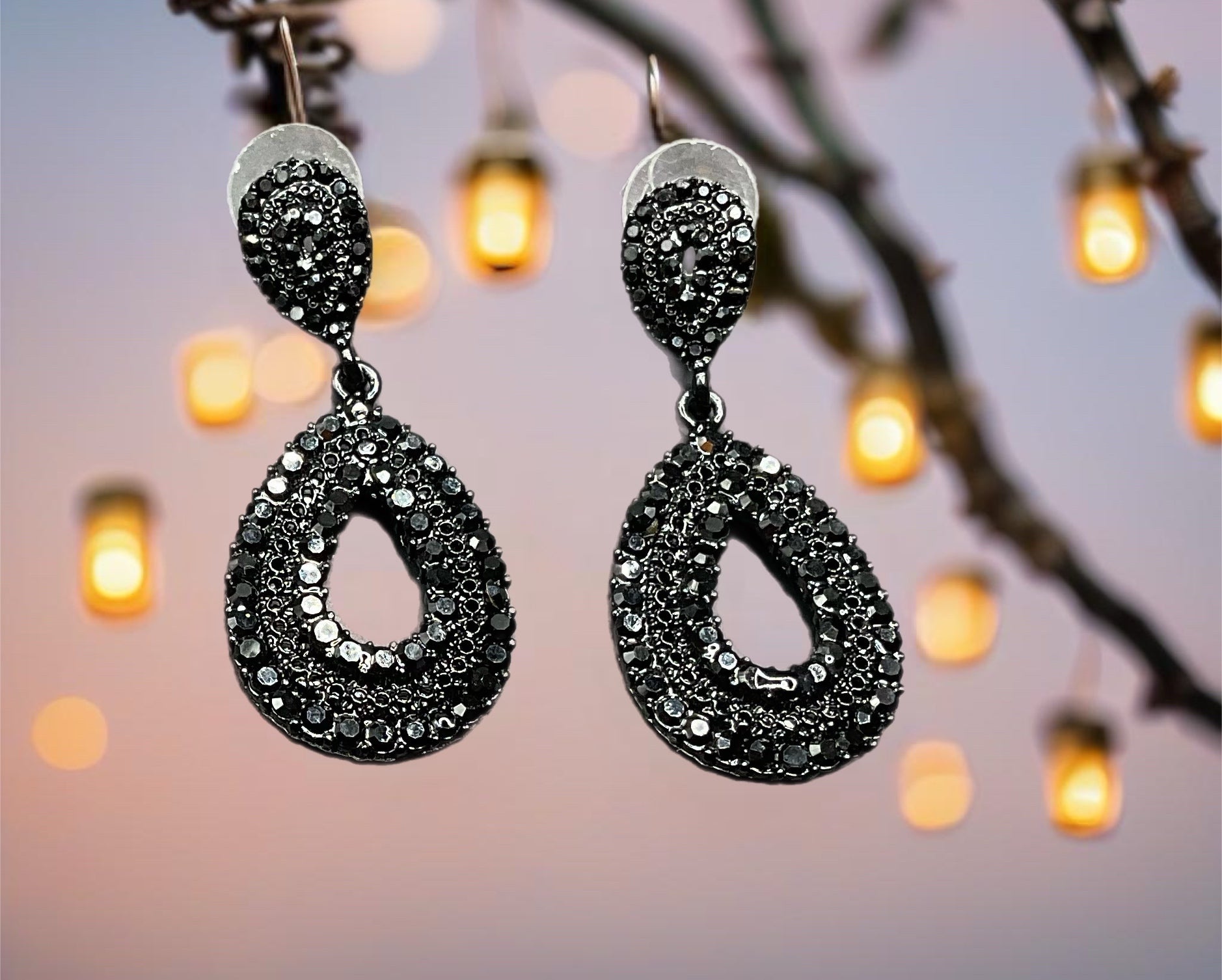 Black dangle earrings in a circular shape with a hollow center, topped with an almond cut jewel stud.