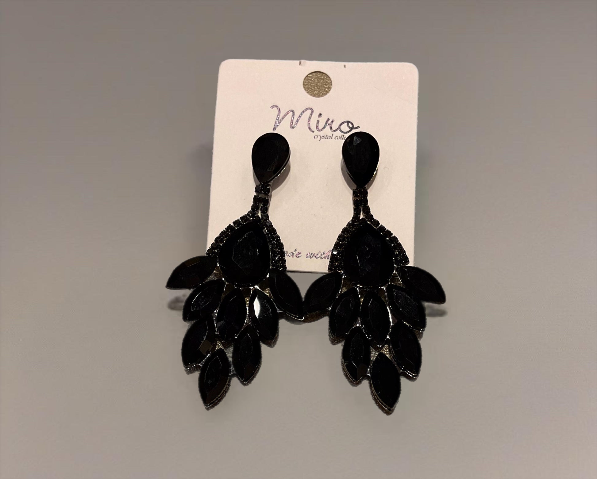 All black dangle earrings with almond shaped jewels arranged to create a feather-like design, topped with an almond cut black stud.