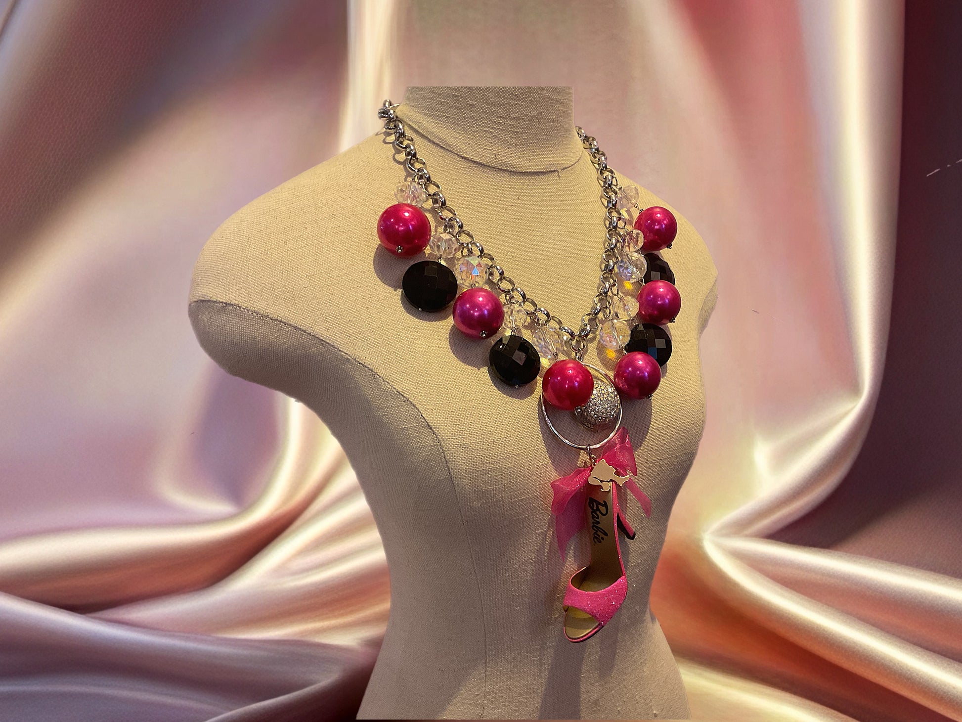 Make a bold fashion statement with this distinctive Barbie heel necklace, featuring oversized beaded embellishments that command attention. A playful yet sophisticated accessory that elevates any ensemble with its eye-catching design and expert craftsmanship.