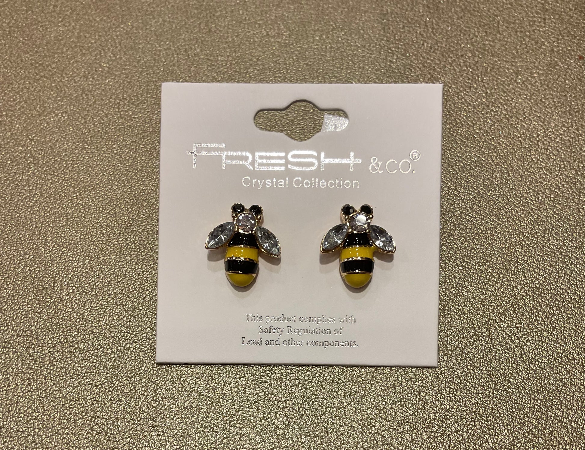Bee-shaped earrings in yellow and black with sparkling rhinestones