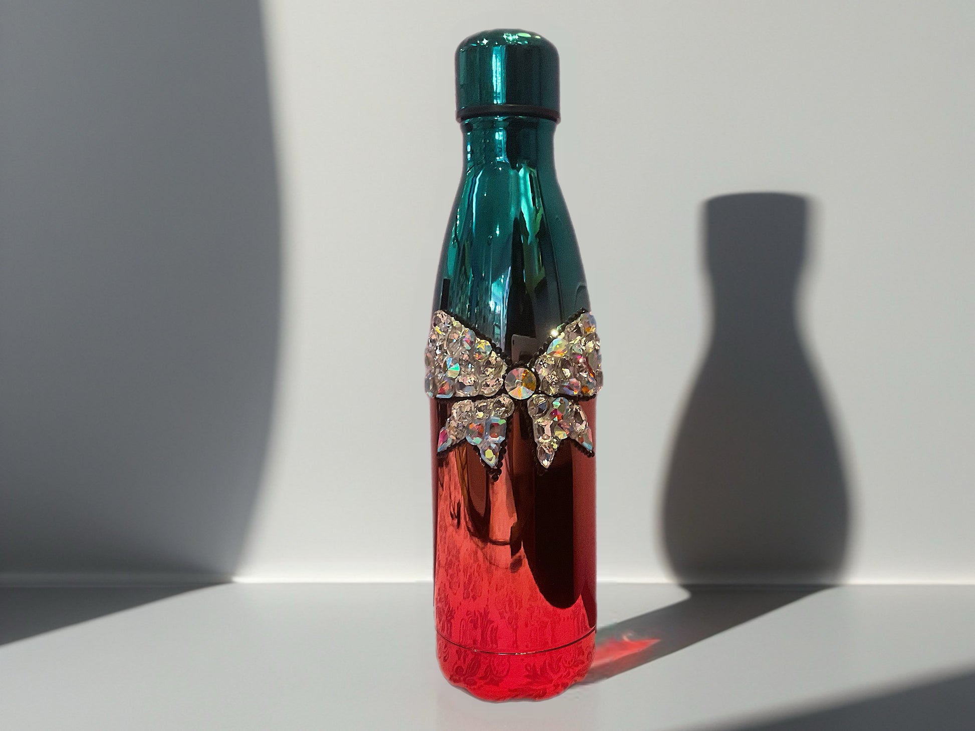 Sophisticated thermal flask featuring a striking chrome ombre finish paired with an elegant rhinestone emblem accent. This insulated sip cup combines refined aesthetics with practical temperature retention, making it an ideal choice for those who appreciate both style and functionality in their everyday drinkware.