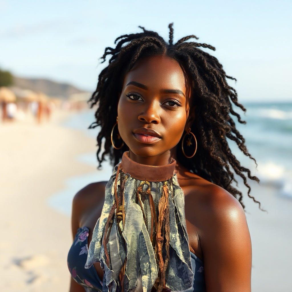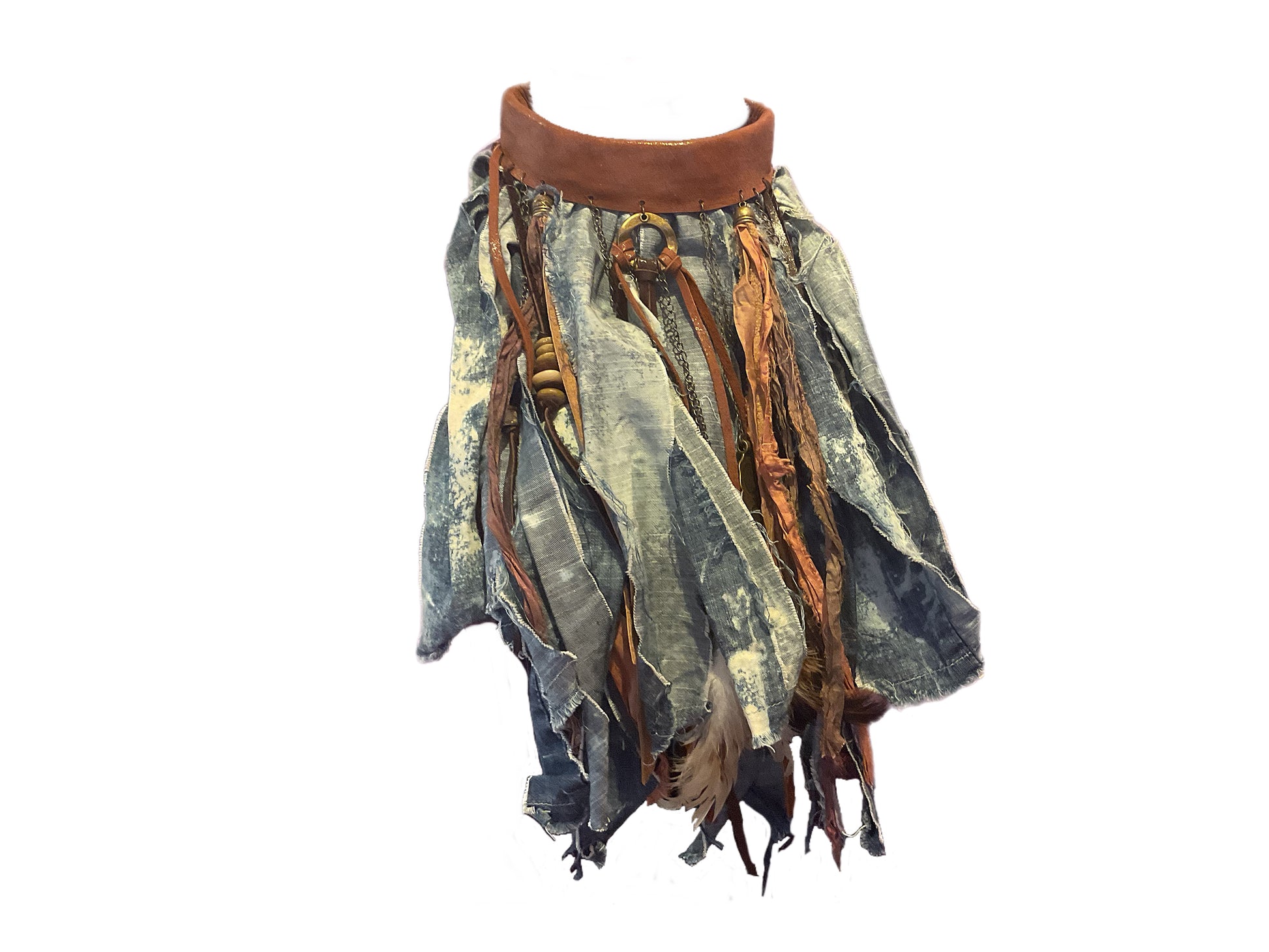 This hand-crafted denim choker features blue jean fringe and leather tassels, accented by distinctive hardware elements intricately woven into an authentic leather band.
