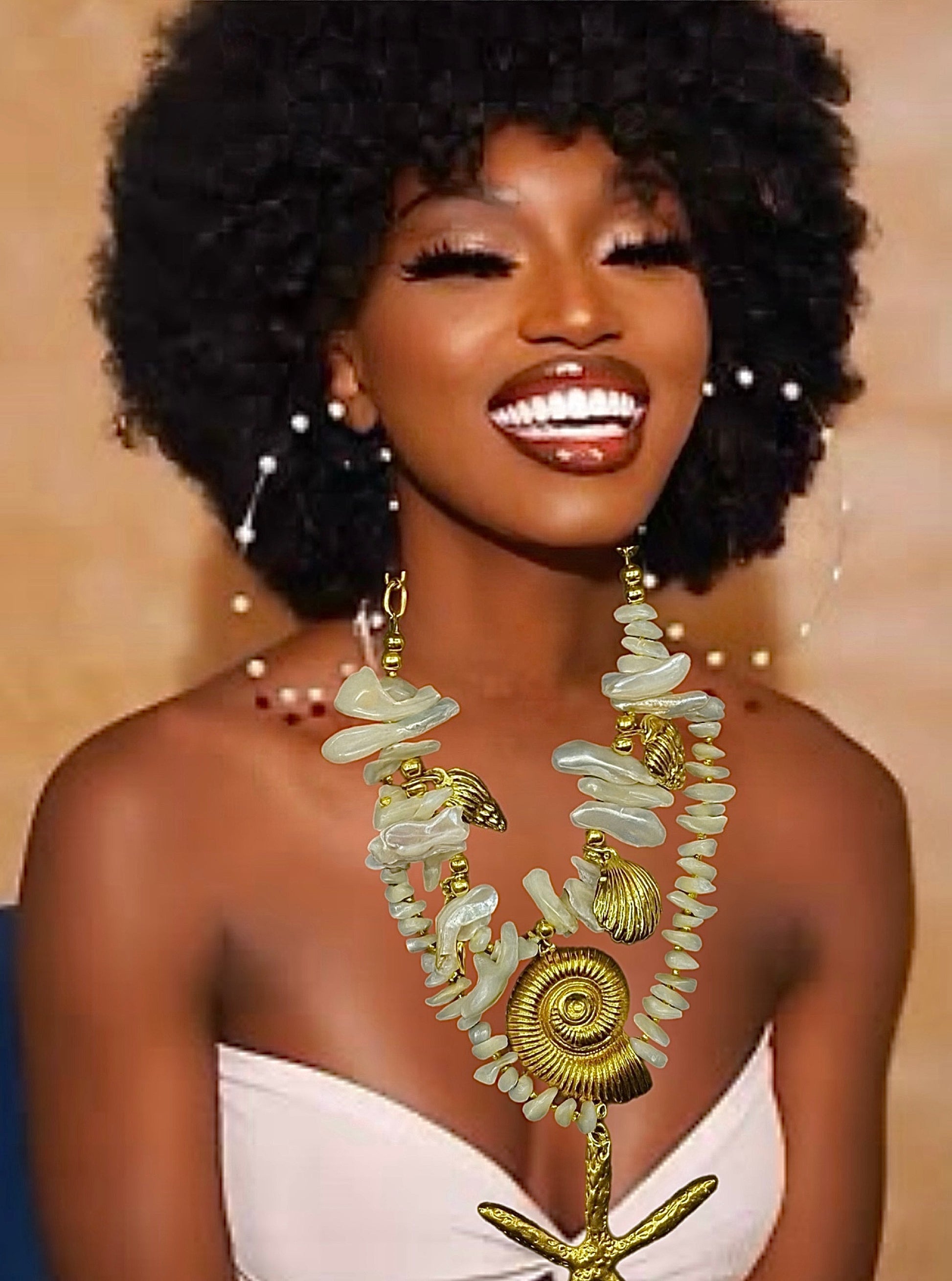 Crafted from 18K gold with water-resistant properties, this necklace showcases pearl drops paired with detailed charms inspired by shells and star gazing motifs.