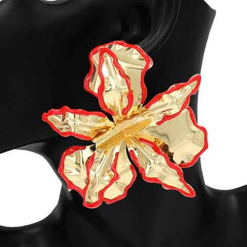 These lotus flower earrings showcase meticulous artisanal construction, featuring a warm golden metal base complemented by striking red detailing that enhances their botanical elegance.