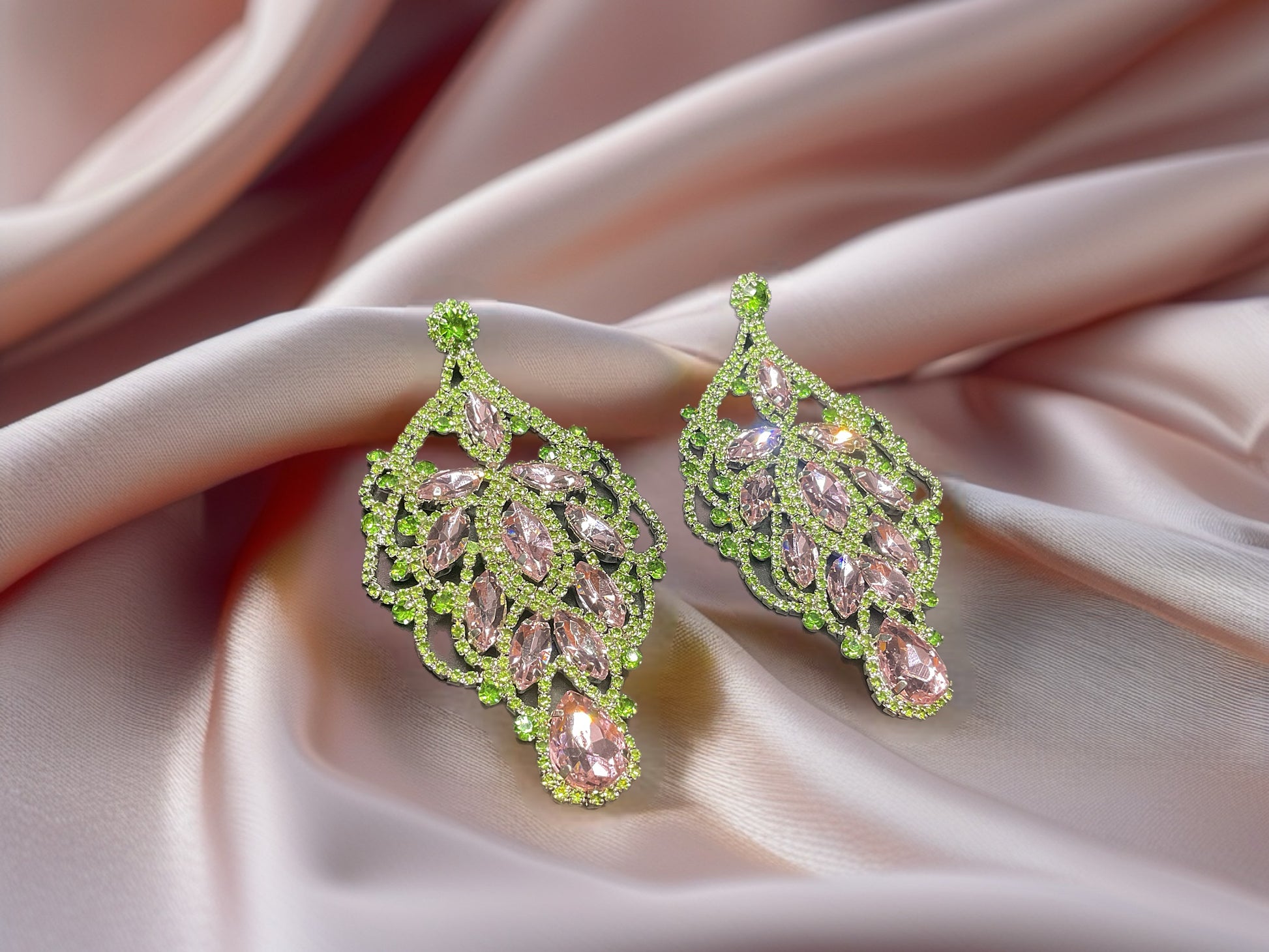 Striking drop earrings featuring oversized pink crystals accented with a verdant crystal border, designed to elevate any ensemble with sophisticated sparkle and dimensional color play.