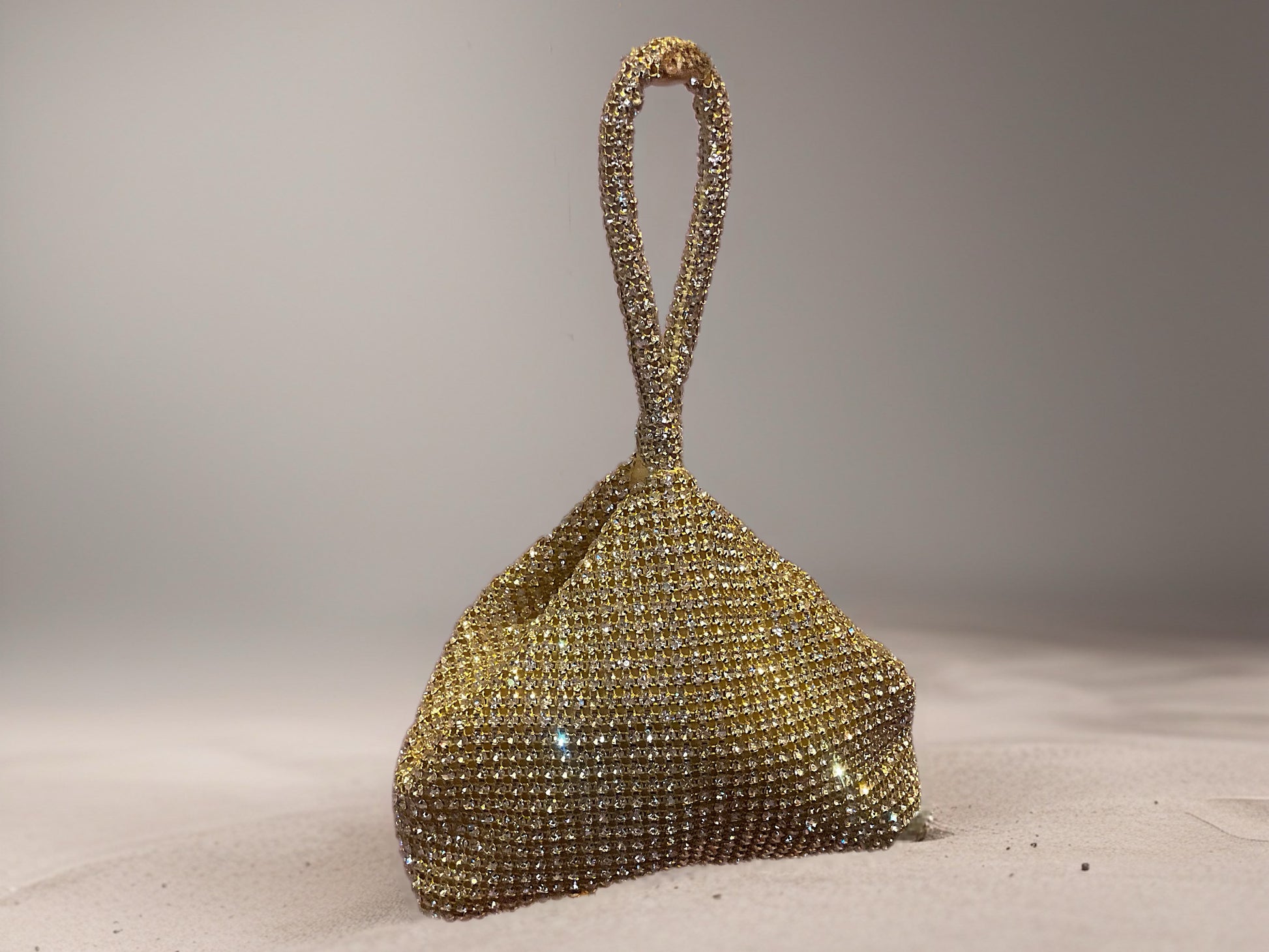 Geometric clutch featuring a striking triangular silhouette crafted with crystal detailing. Equipped with practical wrist straps for versatile carrying options, this piece combines contemporary design with functional elegance—ideal for evening occasions or statement-making everyday wear.