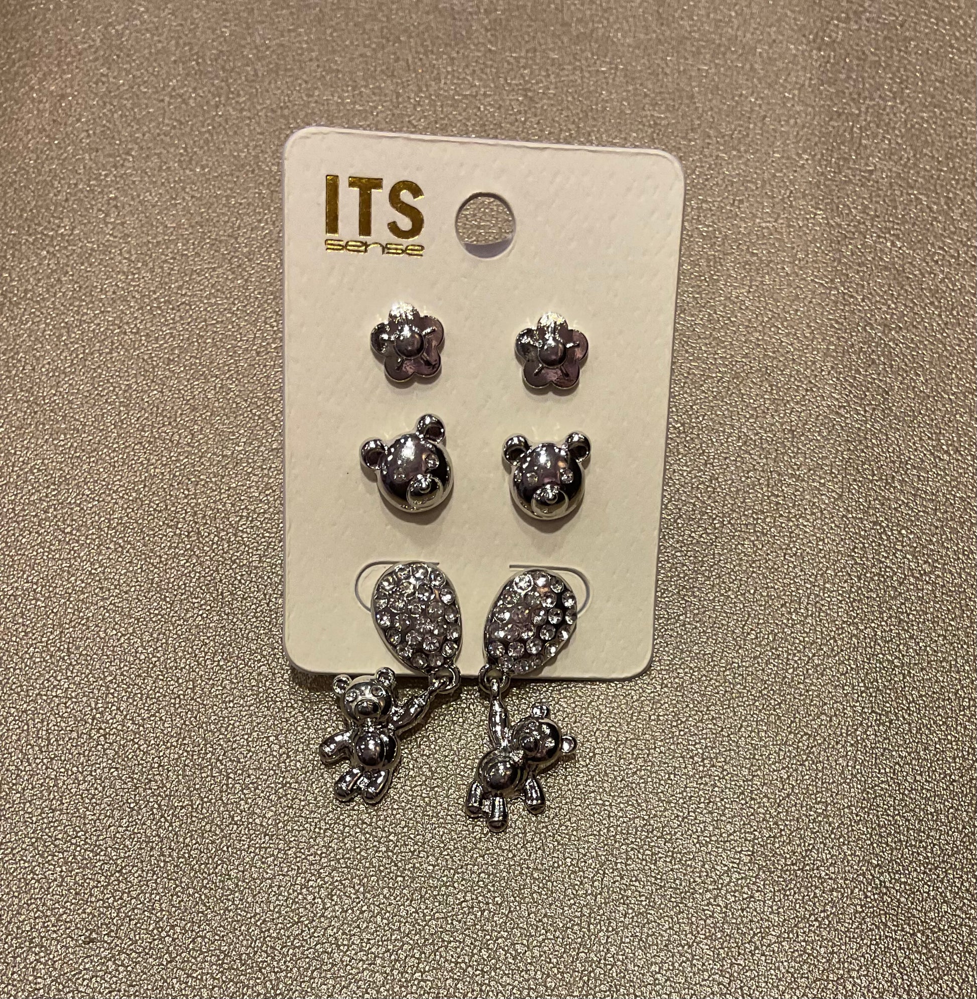 Shiny Sliver trio earring set featuring a flower stud, a bear stud, and a dangling bear with a rhinestone balloon.