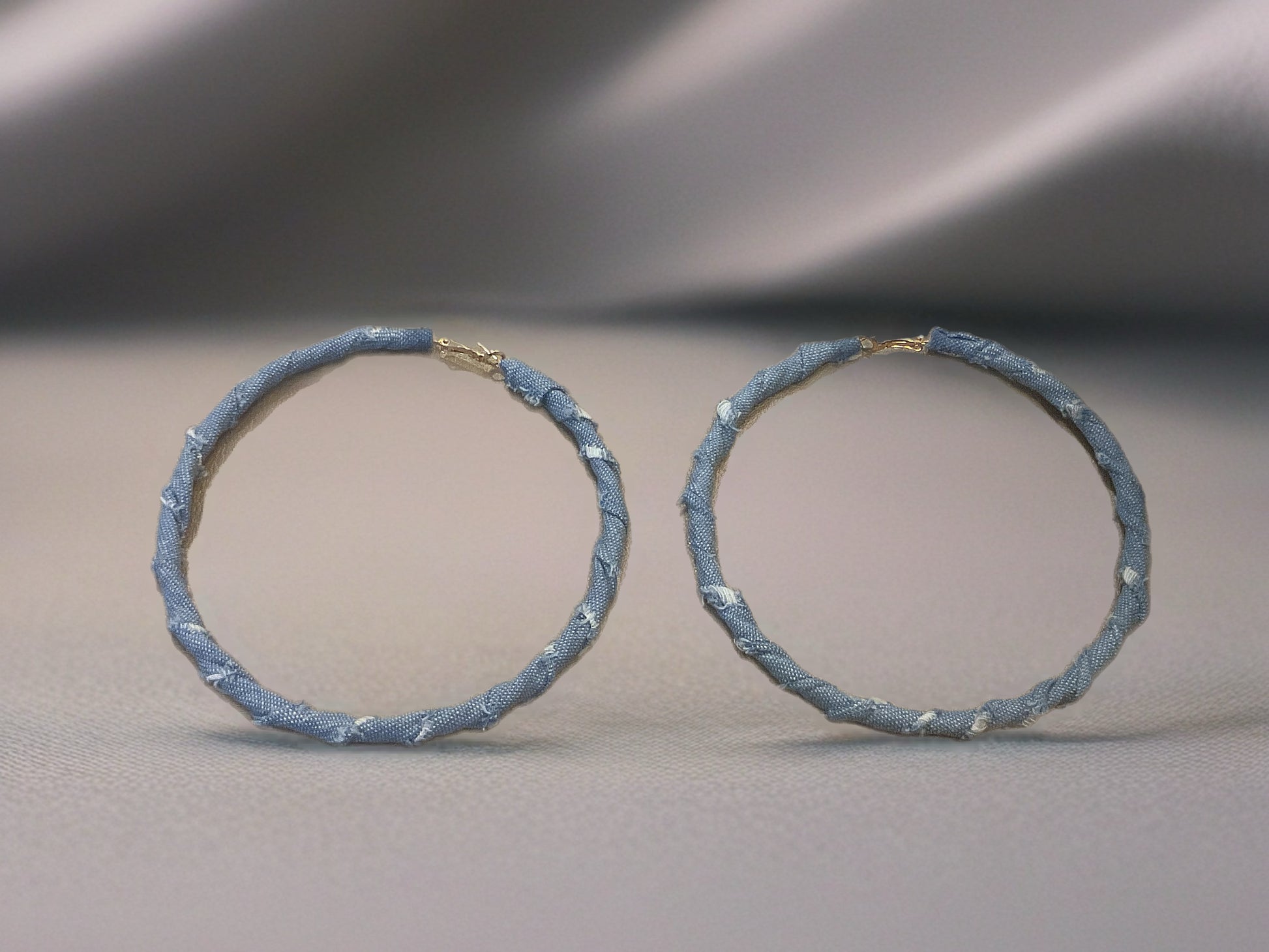 Elevate your accessory collection with these statement denim hoops, expertly crafted to transition seamlessly from day to evening wear. Their generous size commands attention while the denim material adds an unexpected textural element, making them the ideal choice for both relax