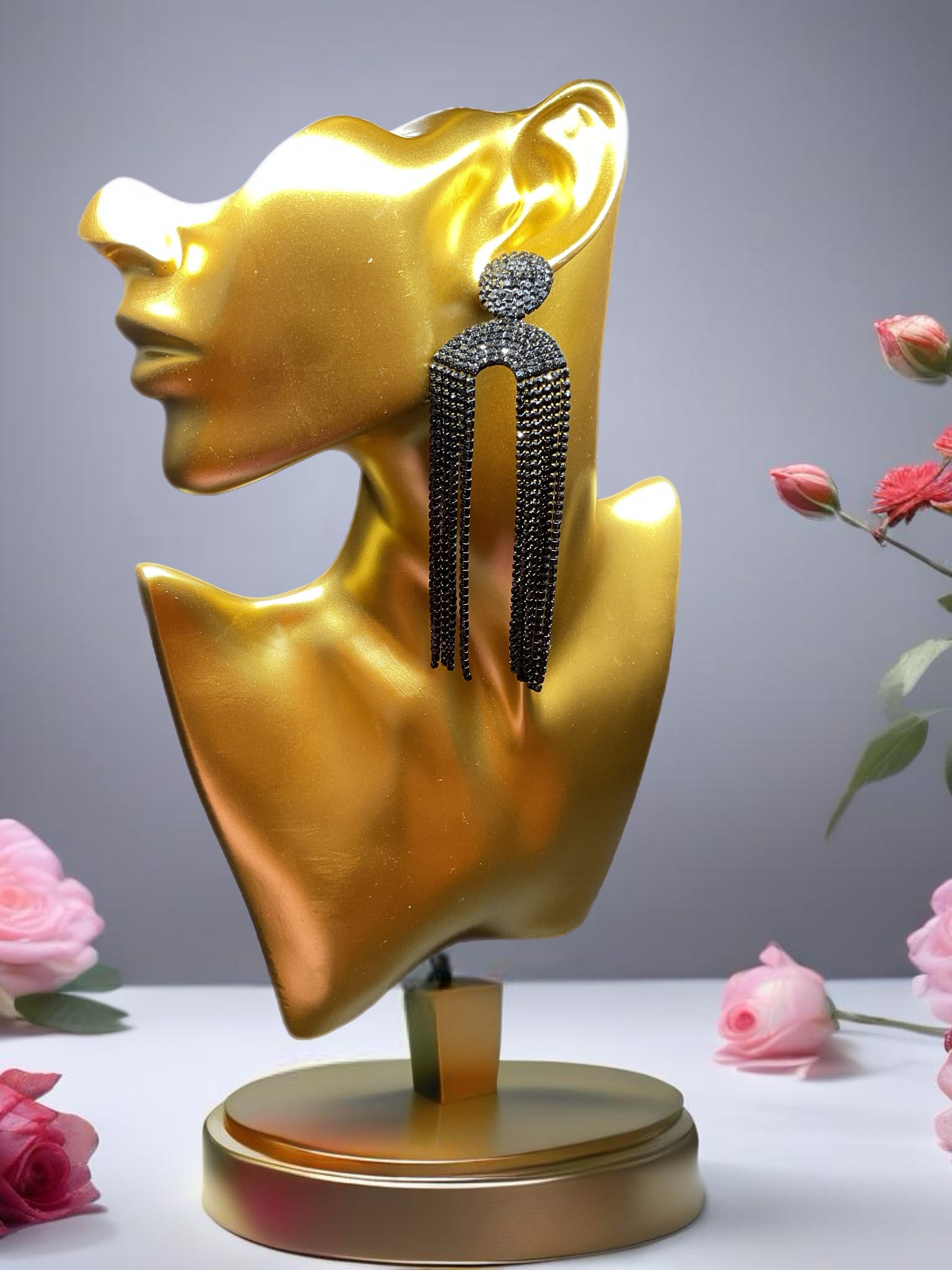 All black crystal fringe earrings forming an upside-down U shape, topped with a circle stud filled with black crystals.