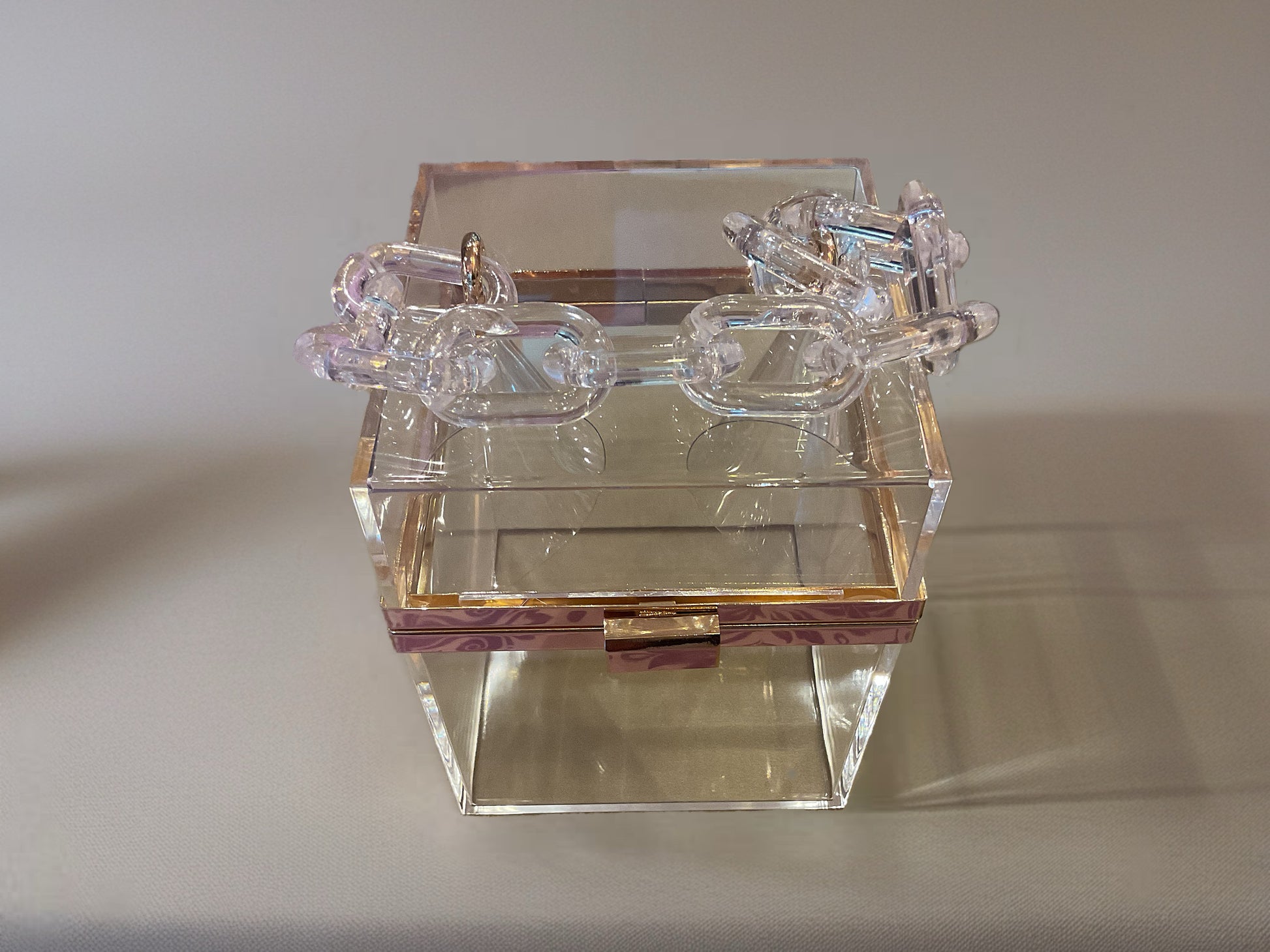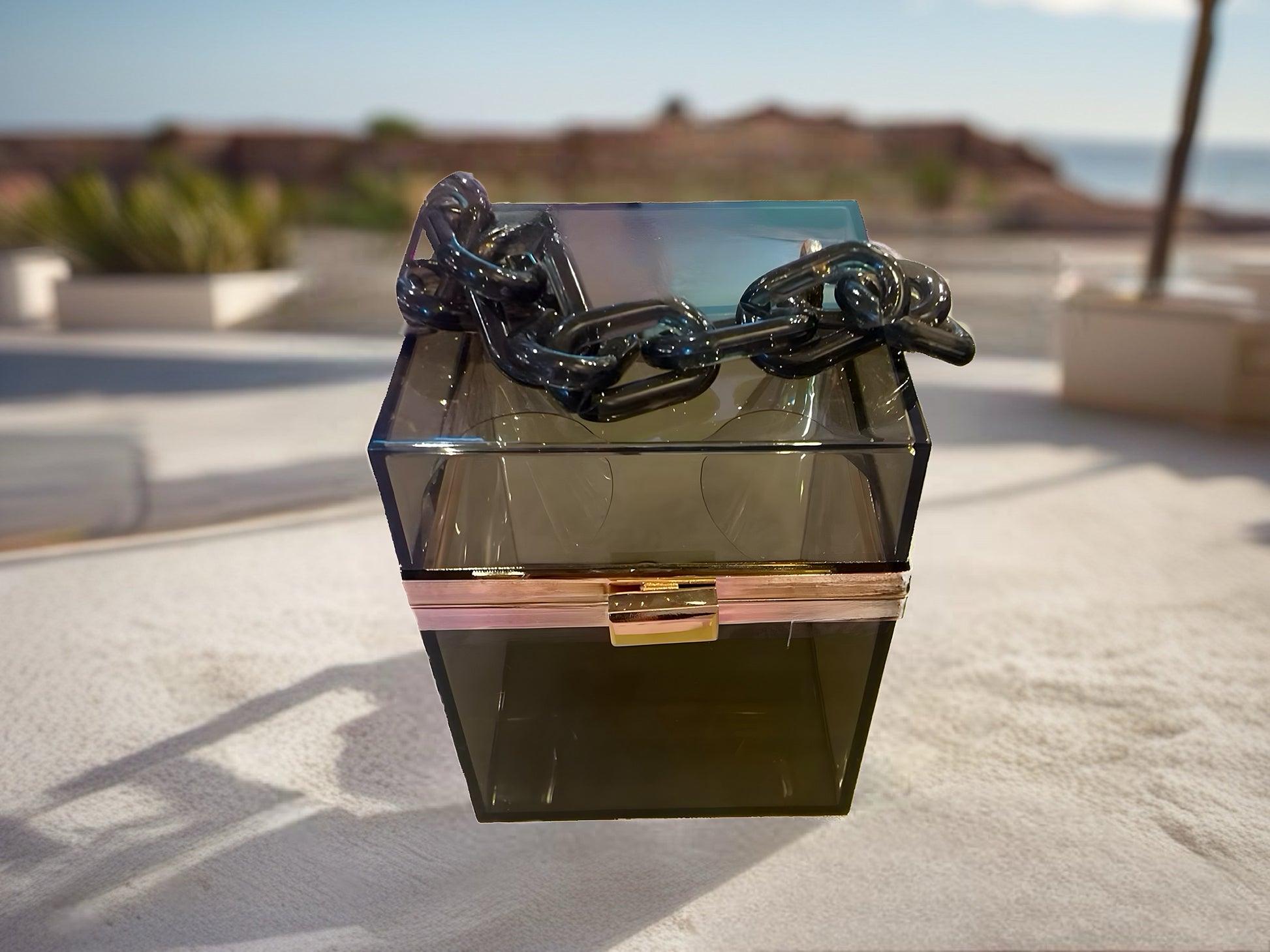 Designed with a square silhouette and transparent clarity, this handbag serves as a versatile complement for both daytime events and evening outings.