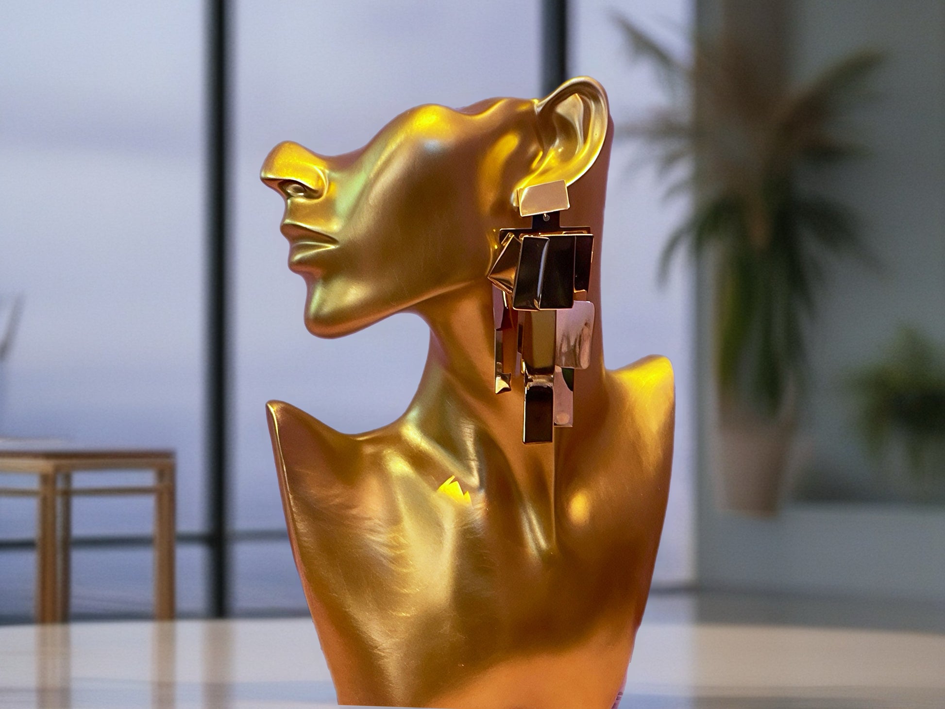 These Bold statement earrings feature layered gold geometric plates that catch the light with every movement, creating a confident and elevated look. Designed to command attention without saying a word, they're the perfect finishing touch for nights out, special events, or stepping into your power every day.
