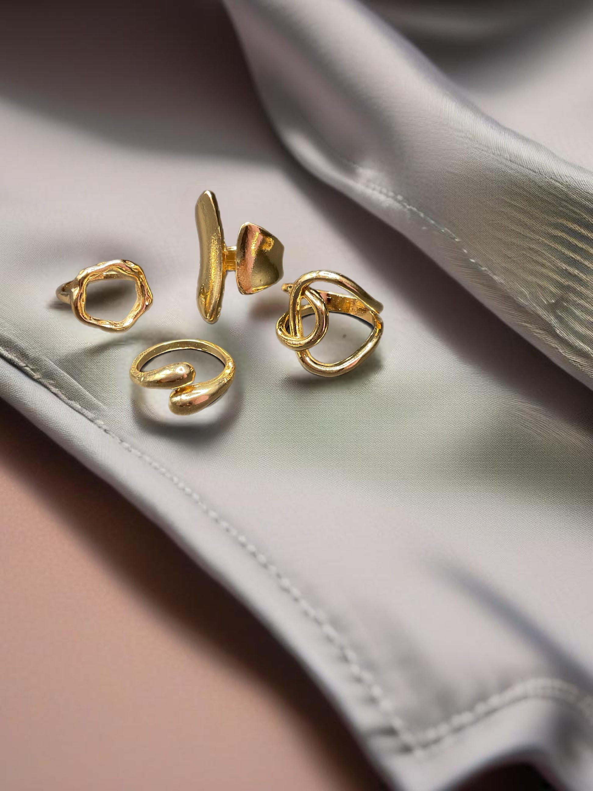 Enhance your style with our Grooving Ring Set. This set includes four rings, two of which feature an elegant overlapping design while the other two have a unique twist design. With this set, you can mix and match or wear all four for a statement look. Elevate your fashion game today.
