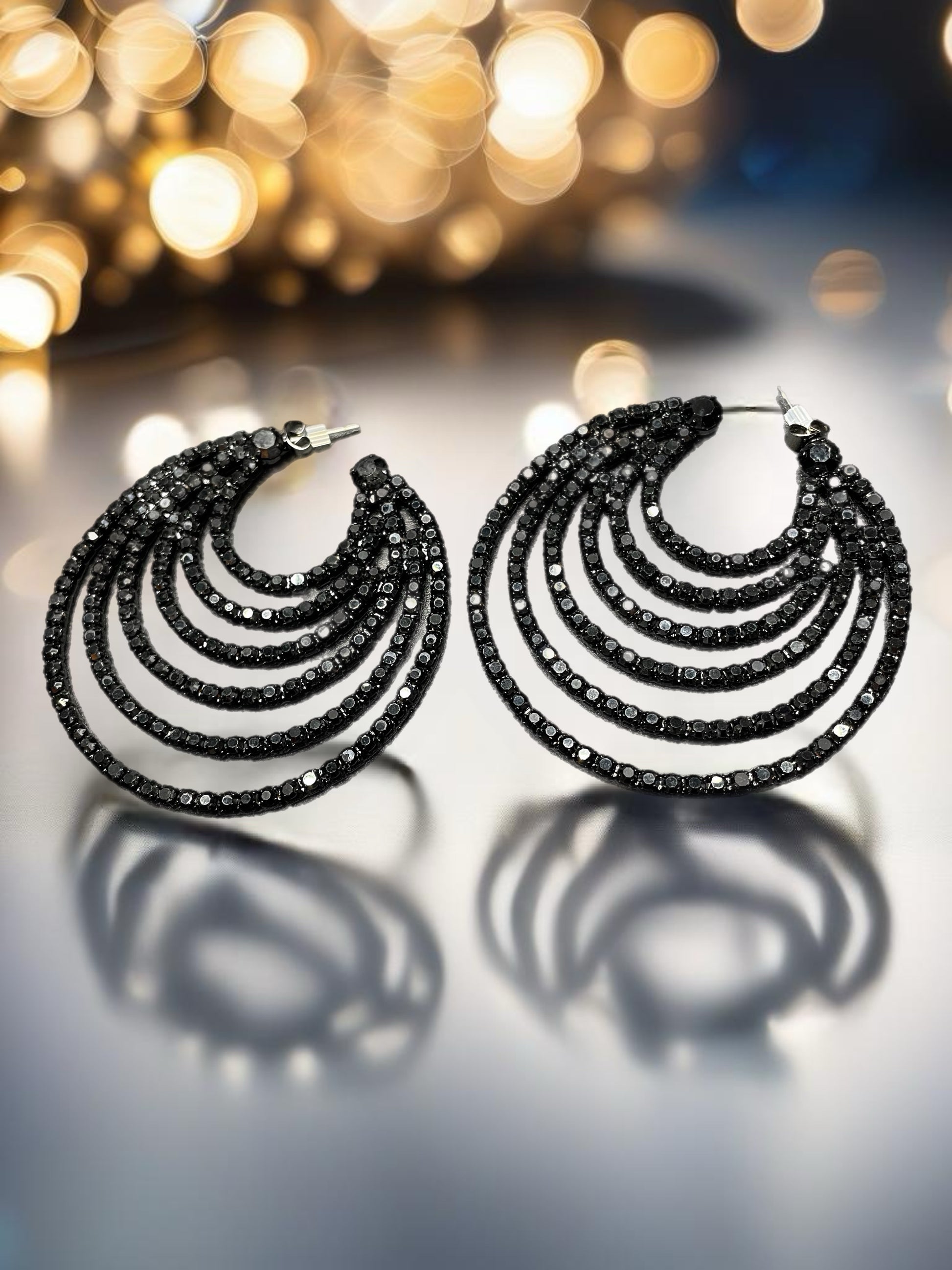 All black spiral hoop earrings adorned with sparkly black crystals.