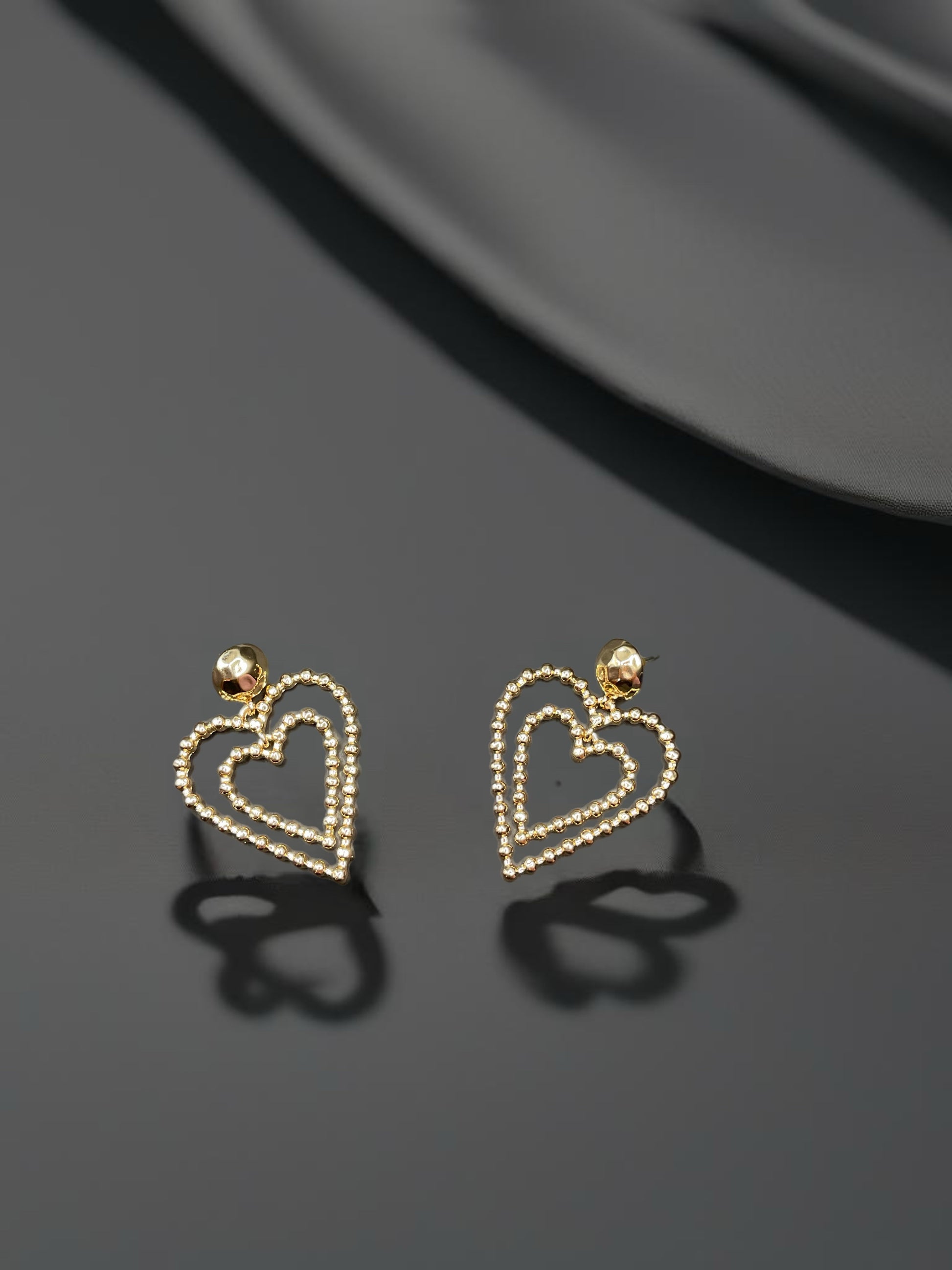 Enhance your style with our Kiss of Elegance earrings. The gold double hearts with studded texture add a touch of elegance to any outfit. Made with high-quality materials, these earrings are a must-have for any fashion-forward individual. Elevate your look with this stunning accessory.