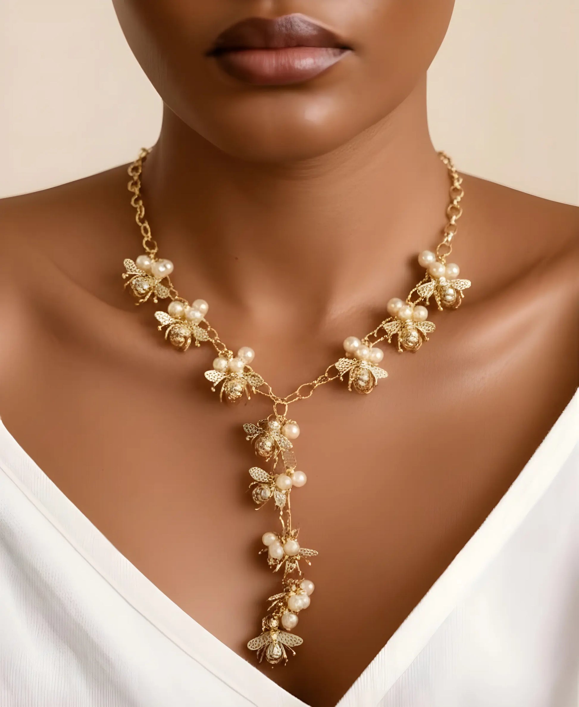 Nature's Fly Jewel features an antique gold finish and a distinctive Y-shaped design, showcasing hand-soldered flies adorned with delicate pearls.