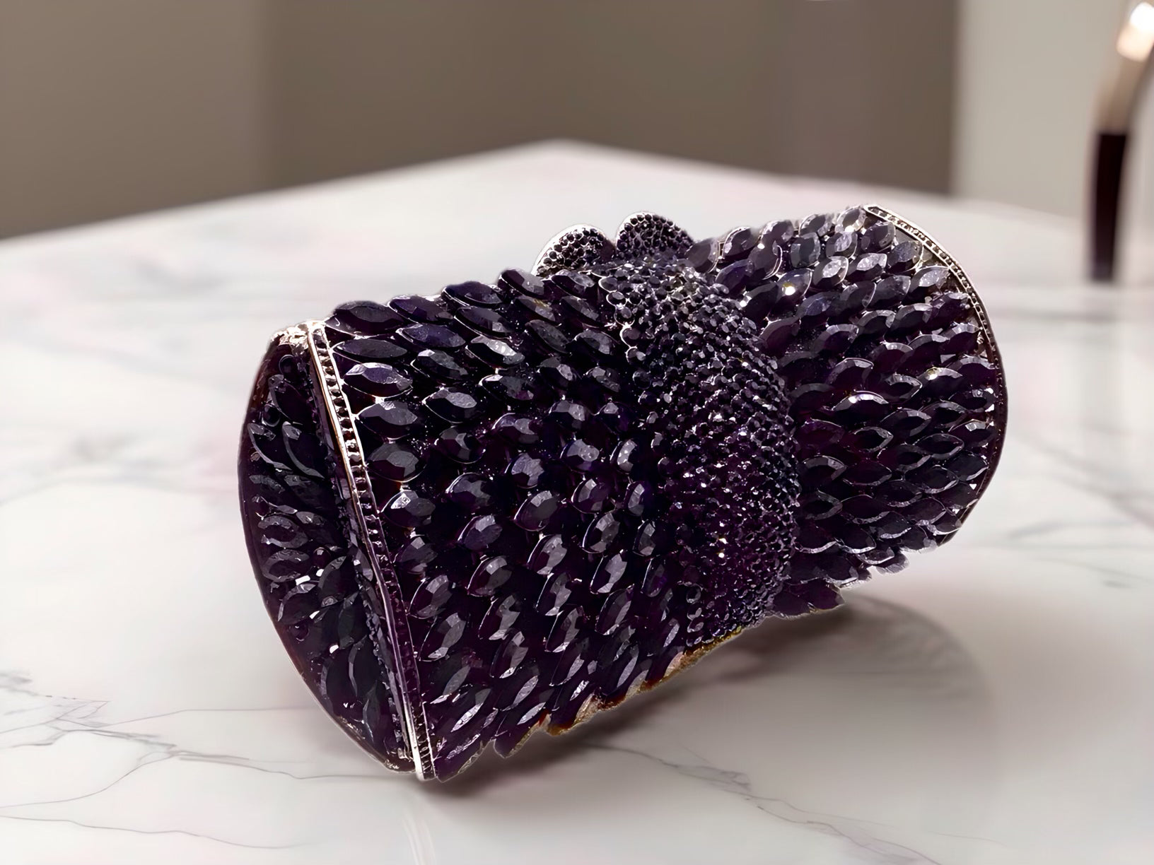 This elegant handbag features intricate detailing and shimmering Swarovski crystals. Its fan-shaped design boasts stunning almond-shaped black crystals, making it perfect for a glamorous evening out or a dinner event. The convenient metal lock clasp allows for effortless opening and closing, while the soft and lustrous silk fabric lining ensures the security of all your essentials.