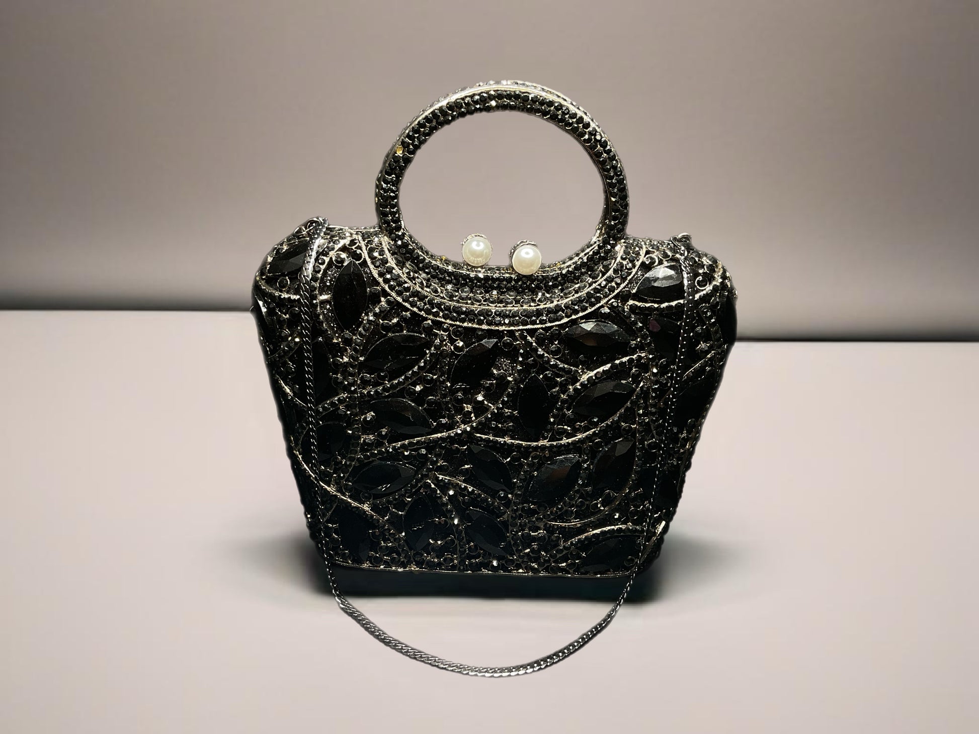 Stunning Onyx Swarovski crystal handheld clutch. Large and small crystals with crystals and pearls encrusted on handle.