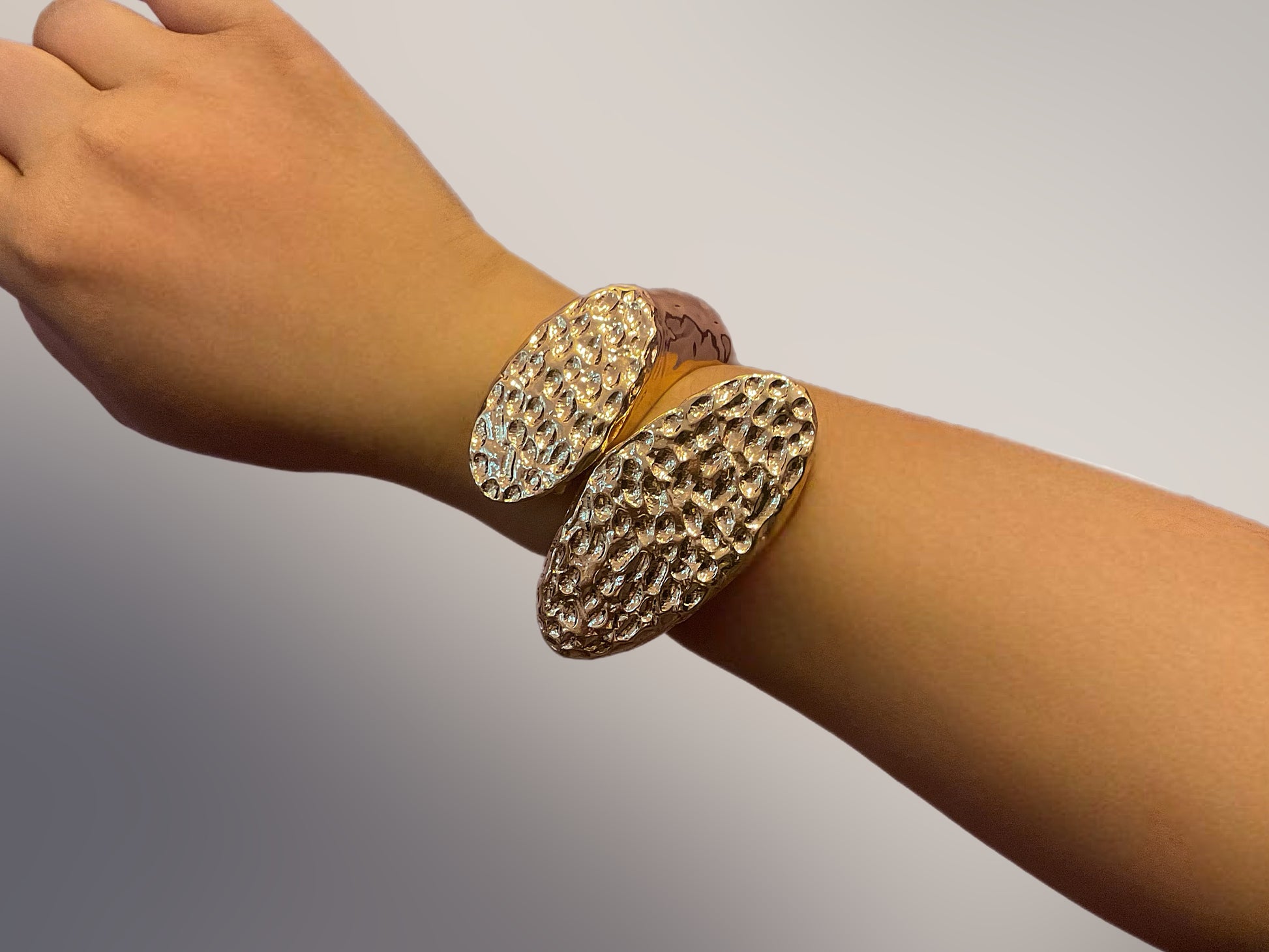 This refined silver cuff bracelet features a distinctive dual semicircle clasp mechanism, combining minimalist aesthetics with functional elegance. The polished finish and geometric closure system create a sophisticated accessory that transitions seamlessly from day to evening wear.
