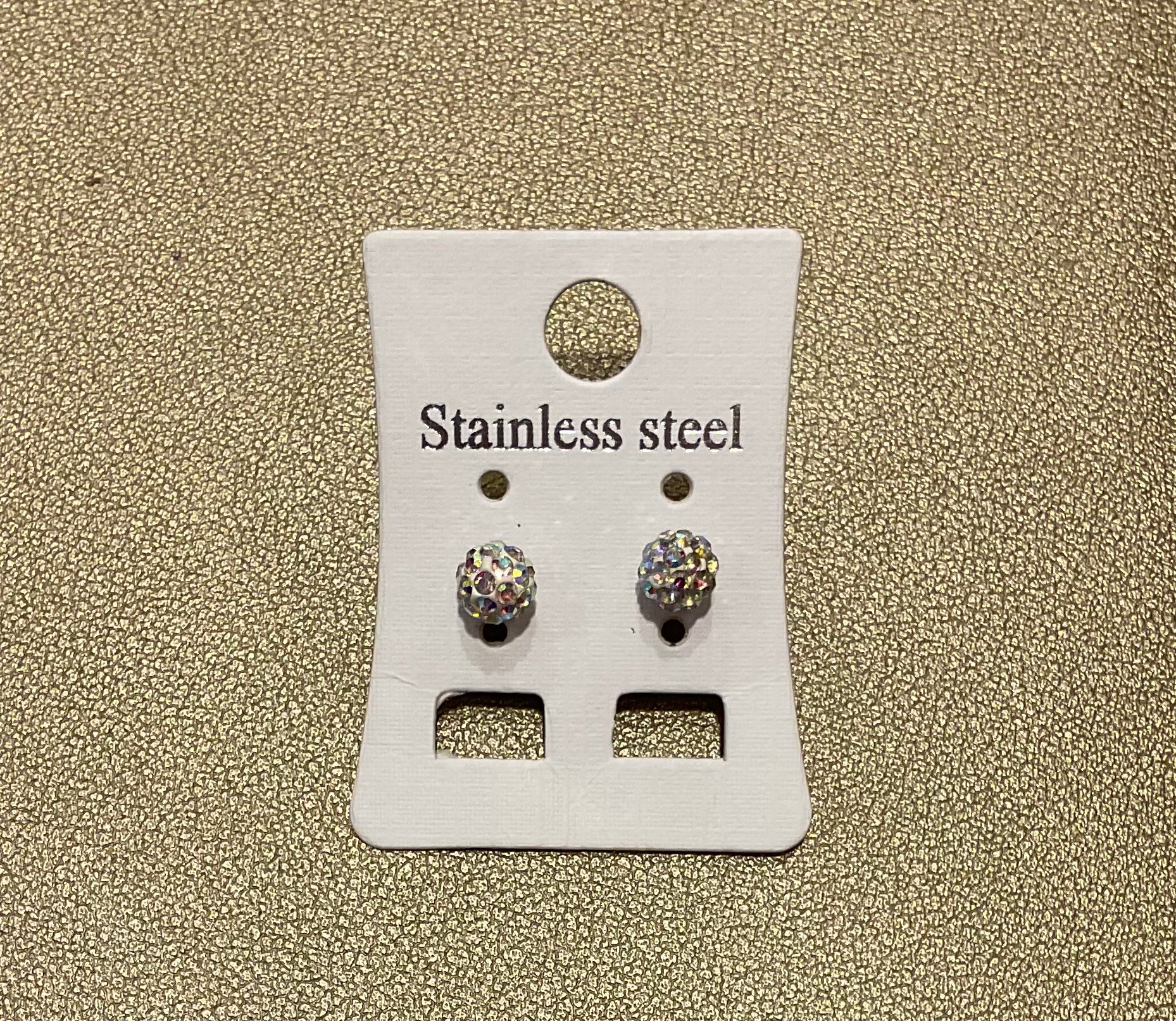 Small circle earrings with a white background, iridescent rhinestones, and a sliver back.