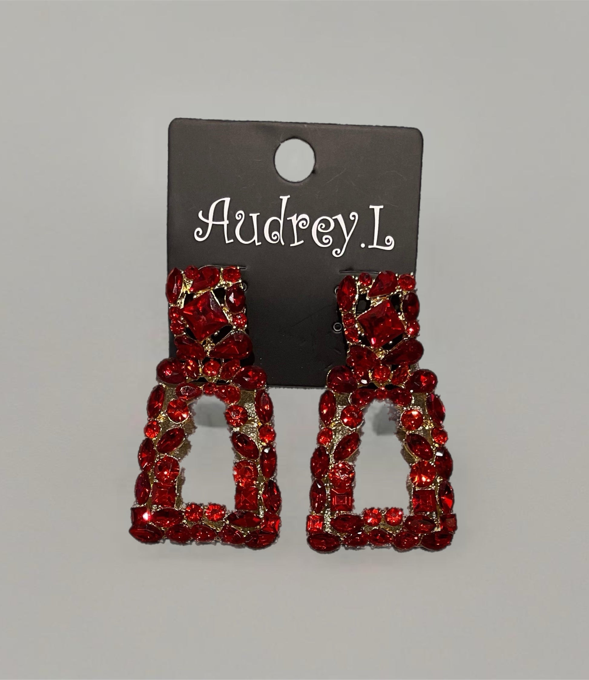 Red jeweled dangle rectangle-shaped earrings with a square stud at the top.