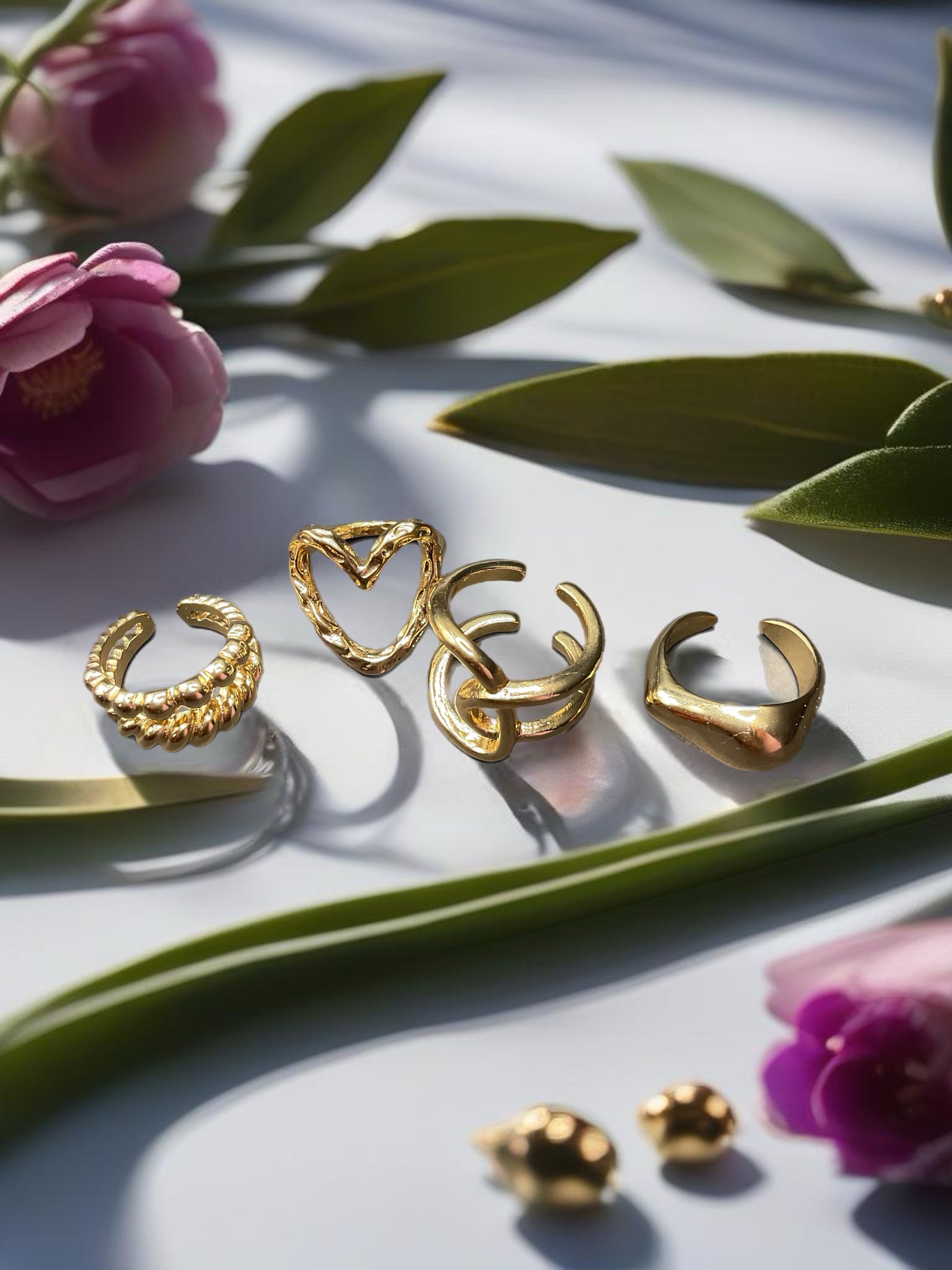 Four medium to large gold ring set. Designs include Heart, beaded, twist overlapping, and solid bold gold.