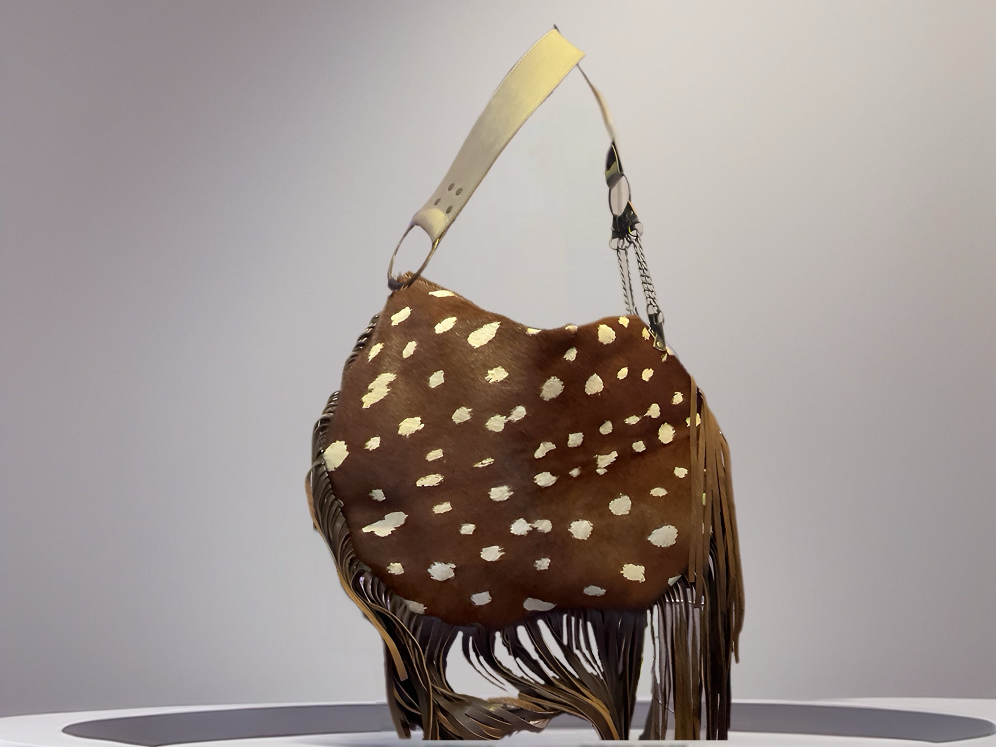 Expertly handcrafted from genuine cowhide leather, this oversized oval handbag features a bold leopard print complemented by elegant fringe detailing.