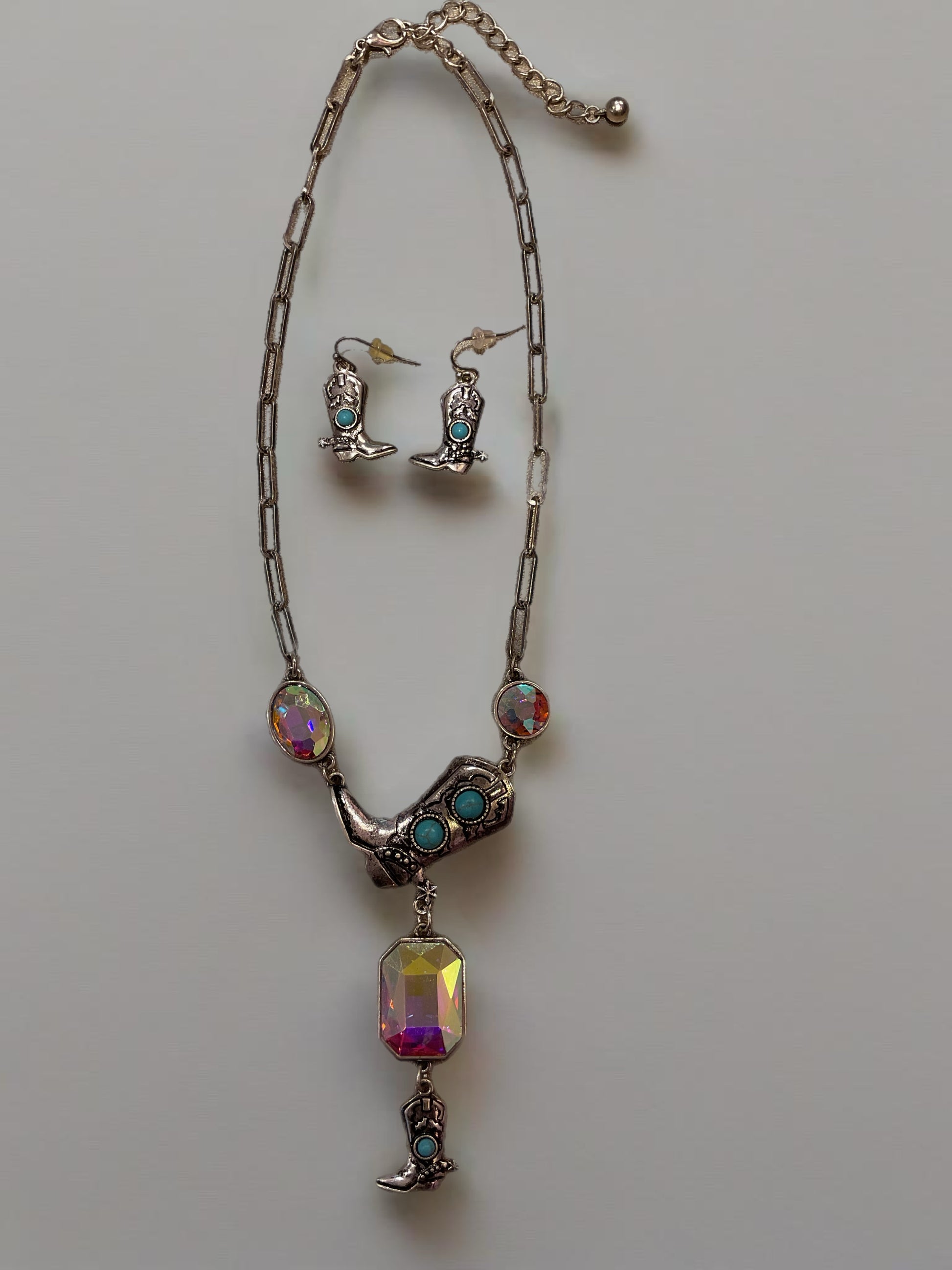 Add a touch of western charm to your wardrobe with the Wild West-Set jewelry set. This set includes a necklace and earrings featuring a cowboy boot & hat charm and iridescent stones. Perfect for any country lover, this set is sure to add a subtle sparkle to any outfit.